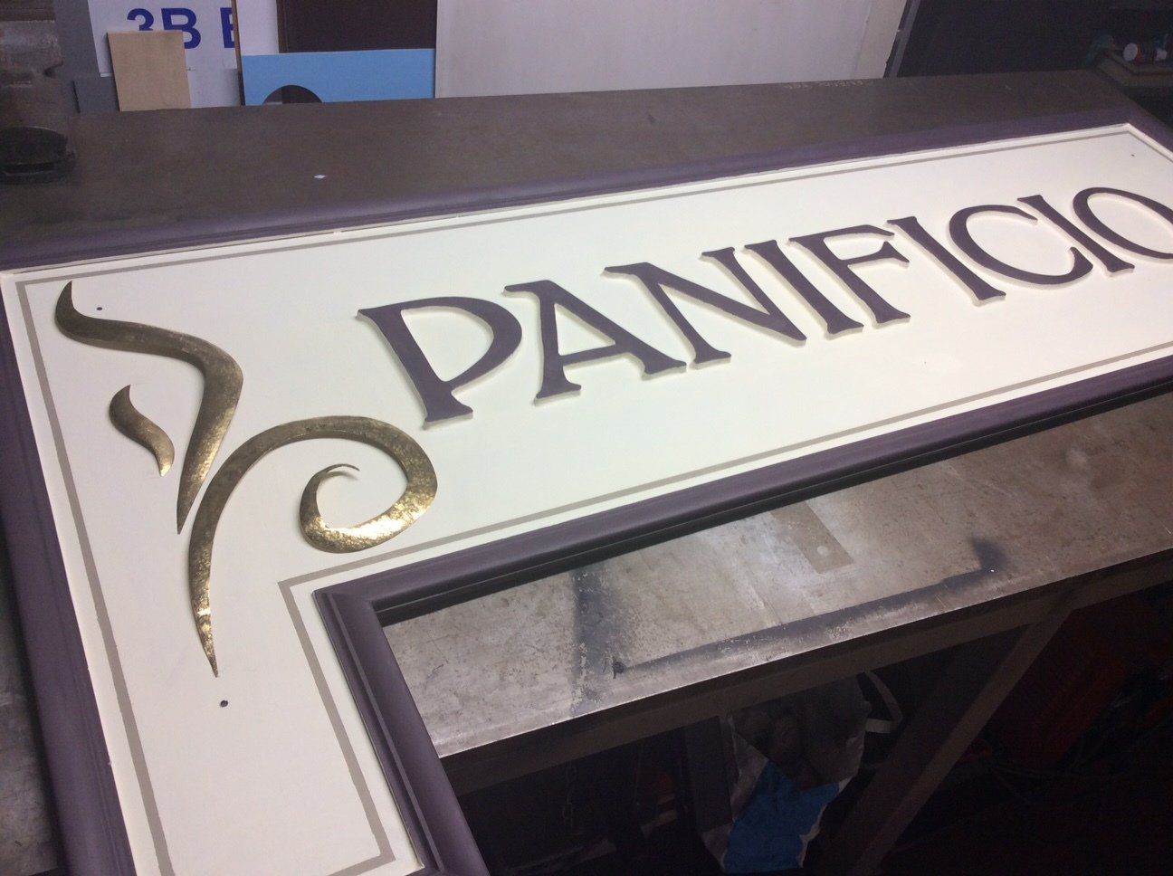 - Lavorazione a foglia d’oro: tecnica preziosa e raffinata, utilizzata per dettagli decorativi su insegne e superfici artistiche.